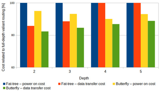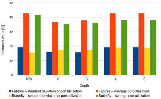 To some extent, this result may be mitigated by using a restricted pivot set. As can be observed in Figure 9 for the fat-tree topology, the cost of activating the switches did not change, but the transmission costs were significantly lower. Specifics of the fat-tree topology cause such behavior. In fact, most (or even all) switches must be actively reducing the possibility of disabling any of them for intensive load scenarios. However, some paths may be shorter when the selected pivot belongs to lower layers, reducing energy consumption. For the butterfly topology, narrowing the search depth to determine the pivots enabled both reducing energy costs associated with data transmission and switching on devices. This is a natural consequence of higher redundancy. The choice of pivots located closer to the servers contributes to shorter paths to such an extent that it is possible to use fewer nodes. Essentially, reducing pivot search depth allows for improving traffic distribution. As can be seen in Figure 10, both the average port load and its standard deviation are slightly lower for depths between 2 and 3 as the result of shortening some of the excessively long transmission paths.