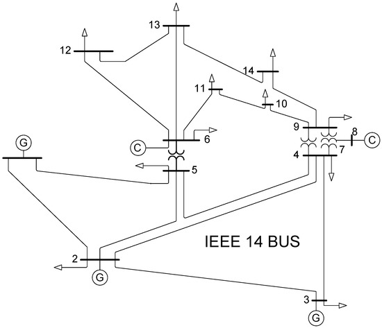 In the IEEE 14-bus system four scenarios were evaluated, which were selected according to the number of available measurements. For the distribution of measurements in each case, a random process was considered, guaranteeing the system’s observability. Figure 11 shows the system IEEE14 bus.