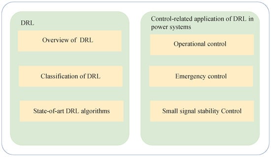 The structure of this paper is as follows. In Section 2, the foundations of (D)RL and various widely used algorithms are presented. In Section 3, an overview of DRL-based methods for power system control applications is given. Section 4 presents the discussion and future directions, and Section 5 concludes with a summary. The structure and main content of this paper are shown in Figure 1.