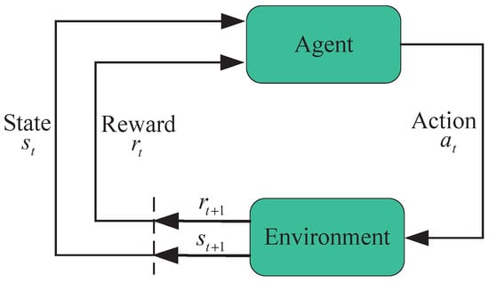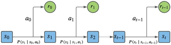 The issues that need to be solved in RL can be dealt with in an MDP. The purpose of an MDP is to simplify the environment. While the state signal and environment satisfy the Markov property, i.e., the next state and the expected reward must only be decided by the current state and action, it can be formulated as an MDP. An MDP is applied to provide a mathematical framework for describing decision-making problems in a situation where results are both partially unpredictable and partially under the decision maker’s control [15]. An MDP can be described as a tuple , where R is the reward function, P is the transition probability (1) with the transition matrix (2), is the discount factor, and .