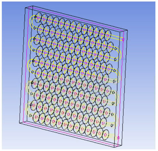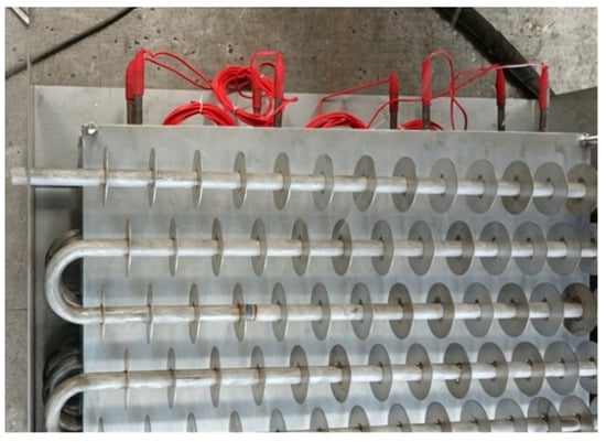 The physical model diagram of the phase-change TES device studied in this paper is shown in Figure 1. The physical model of the device mainly consists of a metal coil with fins and a square box outside the device. The internal space of the box is 820 mm long, 290 mm wide, and 800 mm high. There is one group of serpentines with fins inside the box, and each group of coils is composed of 10 straight pipes with a length of 700 mm, 9 semicircular pipes with a radius of 38 mm, and inlet and outlet pipes. The fin thickness is 1 mm, and the fin spacing is 50 mm. The heat transfer fluid enters from the top of the coil and exits from the bottom.