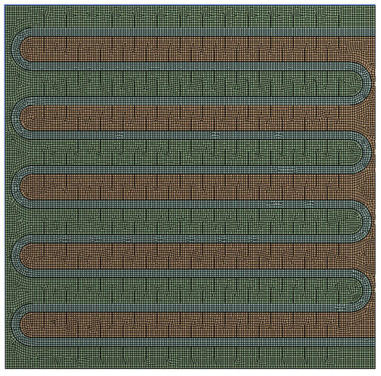 The results of the grid independence test can be found in Figure A2 in Appendix A. It can be seen that, under the same operating conditions, the simulation results of the three grid models with different numbers of grids almost overlap. To balance computational accuracy and speed, this study chose the grid model with 32118 grids, as shown in Figure 2. The model was then imported into the FLUENT software for simulation, which is based on enthalpy–porosity and finite volume methods [9].