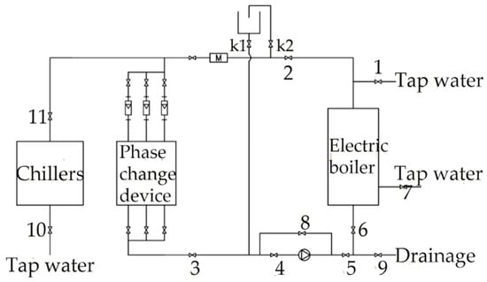 The experimental system principle is illustrated in Figure 4, the symbols 1–11 in the figure represent valvesDuring the charging process, hot water flows from the electric boiler into the phase change heat storage device for heat exchange, passes through the water pump, and then returns to the electric boiler for reheating. During the discharging process, the electric boiler or the chiller provides low-temperature water at a specified temperature, which flows into the phasechange heat storage device to absorb heat and raise the water temperature. The temperatures at different measurement points within the device and the inlet and outlet water temperatures are recorded under different conditions using a data logger.