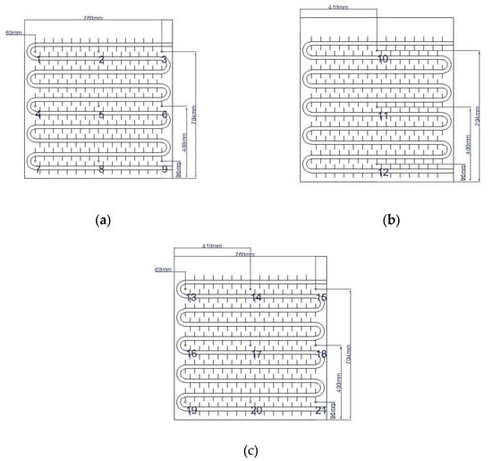 Arrangement of thermocouple measurement points within the unit case: (a) tube coil 1; (b) tube coil 2; (c) tube coil 3.