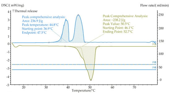 The present study focuses on the application of a PCM in a solar thermal system for providing space heating and domestic hot water in residential buildings. To meet the operational requirements of the system, a commercially available PCM produced by Hubei Saimo, China New Energy Technology Co., Ltd. in China with a phase-change temperature range of 45–50 °C is selected. Figure 7 shows its DSC performance test chart (DSC data provided by the company): the PCM exhibits a high energy storage density, small undercooling, and good thermal stability. The melting onset, peak, and end temperatures are 46.1, 50.5, and 52.7 °C, respectively, with a melting enthalpy of 238.2 kJ/kg, while the solidification onset, peak, and end temperatures are 36.9, 44.8, and 48.1 °C, respectively, with a solidification enthalpy of 236.9 kJ/kg.