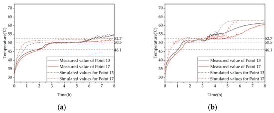 To verify the agreement between experimental and simulation results, Figure 8 compares the measured and simulated temperatures at measuring points 13 and 17 under 2 thermal storage conditions. The average relative errors between the simulated and experimental values at measuring points for the charging process (a) were 2.69% and 6.24%, respectively, while for the charging process (b) they were 3.13% and 5.86%, respectively. Overall, the experimental and simulated values showed good agreement. There could be two reasons for the errors: (1) the simplification assumptions made during the numerical simulation calculation and the neglect of heat loss in the phase-change device and (2) the fluctuation in the outlet water temperature of the electric boiler and the chiller during the experiment, while the outlet water temperature in the simulation was constant, which resulted in errors.