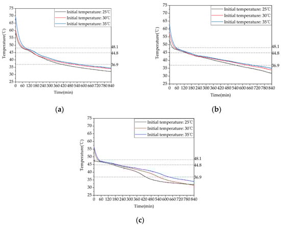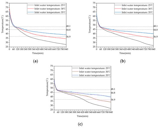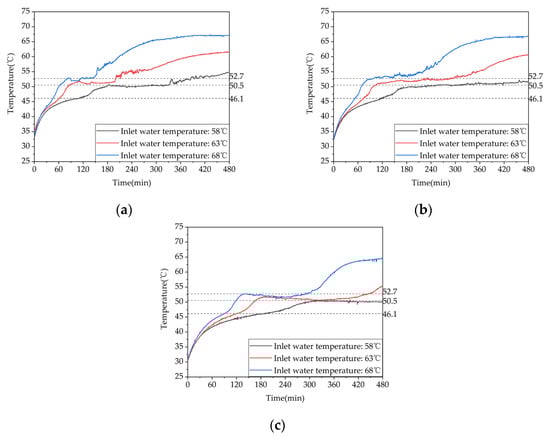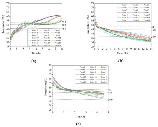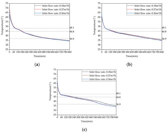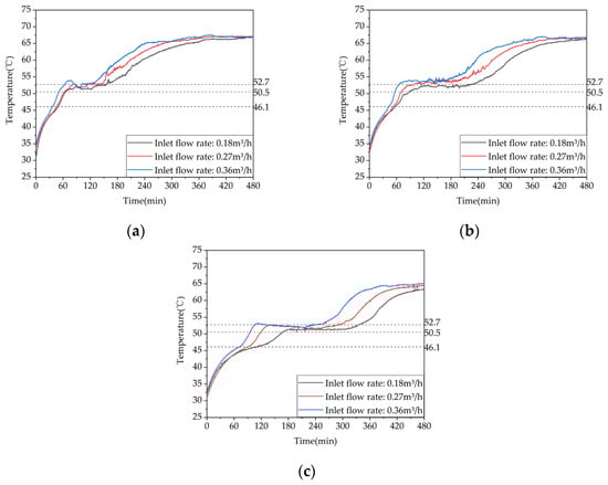 Temperature variation inside the phase-change heat storage: (a) heat storage condition (with the inlet water temperature of 63 °C and an inlet flow rate of 0.27 m³/h); (b) heat release condition of heating (with the initial temperature of the device at 58 °C and the water inlet temperature and flow rate at 30 °C and 0.27 m³/h, respectively; (c) domestic hot water heat release condition (with the initial temperature of 58 °C, an inlet water temperature of 25 °C, and a flow rate of 0.05 m³/h).