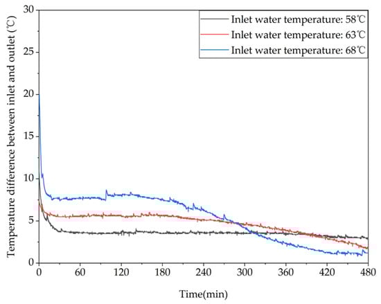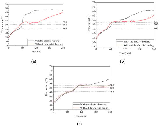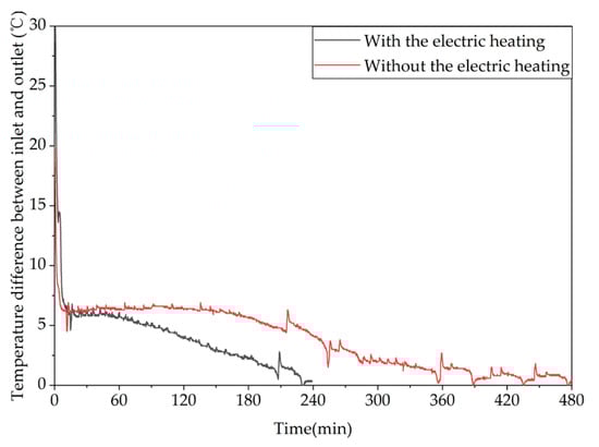During the experiment, the data were recorded using a data collector and the change in the temperature of the measurement points on the PC was observed. The test was considered to be complete when the temperature of the measurement points in the device remained stable around the inlet temperature or when the heat storage time was up to 8 h, the heating heat release time was up to 14 h, and the outlet temperature was below 35 °C in the domestic hot water heat release operation.