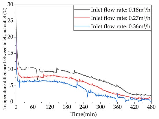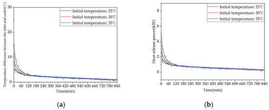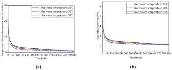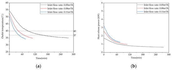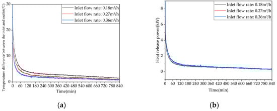 The heat release performance of the phase-change TES system determines the energy utilization efficiency on the demand side. The evaluation indicators for the heat release process mainly include the inlet and outlet water temperature difference, effective heat release time, effective heat release efficiency, and heat release power. Among them, the effective heat release efficiency is defined as the ratio of the energy content in the water discharged from the TES during the effective heat release time to the stored heat energy in the TES at the beginning of the heat release process.