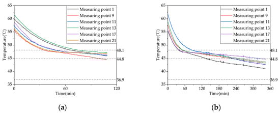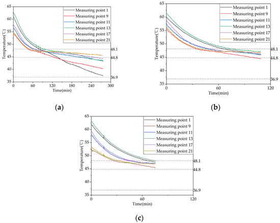 Figure 9a–c illustrate the temperature variation trends of 21 internal measuring points within the device over time, under different operating conditions, including heat storage, heat release, and domestic hot water heat release conditions. To facilitate the observation of the storage and release heat power, six representative measuring points are selected for analysis and plotted in the phase-change heat storage apparatus. Measuring points 1 and 9 correspond to the most and least favorable heat transfer points of coil group 1, respectively. Measuring point 11 is the center point of coil group 2 and also the center point of the phase-change heat storage apparatus. Measuring points 13, 17, and 21 correspond to the most favorable, center, and least favorable heat transfer points of coil group 3, respectively. Therefore, representative measuring points are selected for comparison under different operating conditions in subsequent sections.