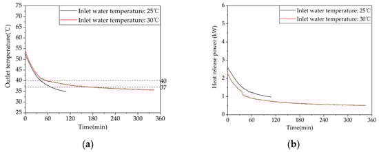 The heat release conditions considered in this paper are classified into two types: effective heat release occurs when the device releases heat for heating and its heat release power is higher than the building heat load (P ≥ 0.338 kW). According to the Standard, the recommended water temperature for shower use is 37–40 °C, while for washbasin spout use it is 30 °C. Additionally, the maximum daily water consumption quota per person per day is 4080 L. Therefore, when the device releases heat for a domestic hot water supply, an outlet water temperature higher than 37 °C ( ≥ 37 °C) is considered effective for showering; for a domestic hot water outlet, a water temperature higher than 30 °C ( ≥ 30 °C) is considered effective. This paper particularly emphasizes the heat release of the device when the outlet water temperature exceeds 37 °C.