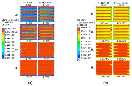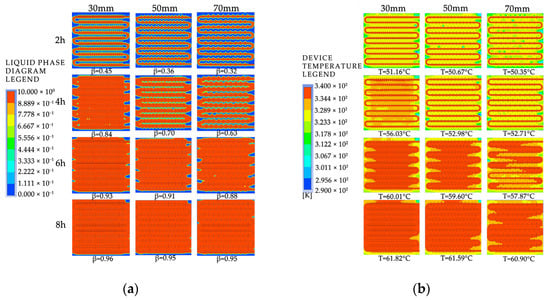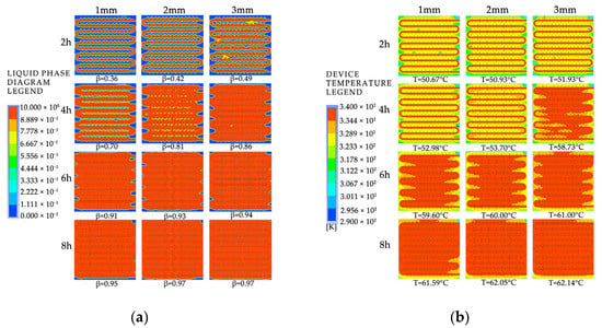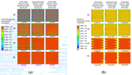 The simulated cloud maps for different inlet directions and installation orientations: (a) liquid-phase fraction; (b) device temperature.