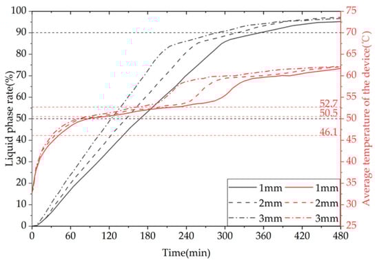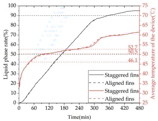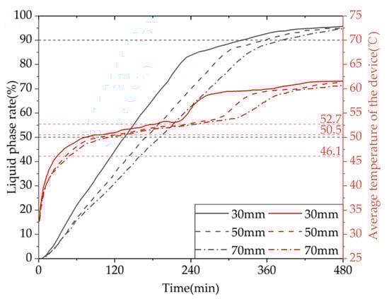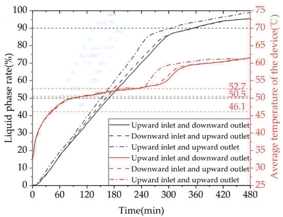 Figure 33 shows the variation curves of the liquid fraction and the average temperature of the phase-change TES device with different water inlet directions and installation methods over time. The gray line represents the liquid fraction curve, while the red line represents the device temperature curve. The time required for the liquid fraction to reach 50% under three operating conditions is 9940 s, 9530 s, and 8940 s, respectively. When the operating condition is changed from horizontal up-in and down-out to horizontal down-in and up-out or vertical up-in and up-out, the time required for 50% of the PCM in the device to melt is shortened by 4.12% and 10.06%, respectively. The time required for 90% of the PCM in the device to melt is 20,710 s, 20,680 s, and 17,770 s, respectively. When the operating condition is changed from horizontal up-in and down-out to horizontal down-in and up-out or vertical up-in and up-out, the time required for 90% of the PCM in the device to melt is shortened by 0.14% and 14.20%, respectively. In conclusion, the heat storage performance of the device is significantly better in the vertical installation mode than in the horizontal installation mode, while the effect of changing the water inlet direction on the heat storage performance of the device is small in the horizontal installation mode. Additionally, the time required for the device’s average temperature to reach 60 °C under the three operating conditions is 23,720 s, 23,250 s, and 19,420 s, respectively. When the operating condition is changed from horizontal up-in and down-out to horizontal down-in and up-out or vertical up-in and up-out, the time required for the device average temperature to reach 60 °C is shortened by 1.98% and 18.13%, respectively. From the graph, it can be seen that within the first 4 h of heat storage the average temperatures of the device under the three operating conditions are similar, while after 4 h the vertical installation device has a significantly improved temperature rise rate.