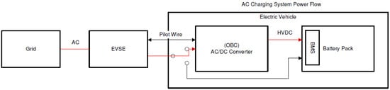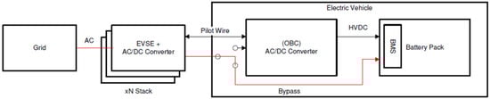 Electric vehicle charging stations are infrastructure providing power to vehicles to charge their batteries. Two types of energy networks exist: direct current (DC) and alternating current (AC). The primary distinction between these two systems is that, in an AC system, the vehicle’s onboard charger typically uses a converter to charge the battery, as shown in Figure 1. Conversely, a DC charger directly charges the battery of the vehicle, as shown in Figure 2. [17].