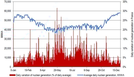 However, with the increasing use of renewable energy sources, such as solar and wind, which are often intermittent in nature, there is a growing need for flexible and adaptable energy sources that can adjust their power output to match changes in electricity demand. As a result, some nuclear reactors are now being designed with load-following capabilities in mind [21]. Moreover, that is the case in France, where more than 75% of electricity is generated from NPPs, and the rest comes from hydropower plants, coal, gas, and fuel oil plants due to this high share of nuclear power. Figure 3 presents the history of the total nuclear generation in France during 2010, where the average daily variation is about 6.7%. However, for some periods, the daily variation reached over 20% [22,23].
