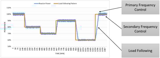 While load following is technically feasible in most nuclear reactors, it may not be economically viable due to several physical effects of power generation and regulations that limit power variations, such as the moderator effect, doppler effect, fission product poisoning, and fuel burnup. Therefore, load following requires higher control technologies for reactors than during the baseload operation [25]. Currently, nuclear power plants operate in four modes: baseload generation mode, which is the most common mode and involves operating the reactor at constant power for most of the fuel cycle, and three methods for power regulation, namely primary frequency control, secondary frequency control, and load following [26], exemplified in Figure 4.