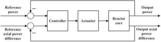 Load following is a power regulation system that enables the plant to follow a variable load power trajectory, programmed to change over time. The energy grid operators set the LF pattern based on power demand and the plant’s maneuvering capabilities. The reactor core load following control is schematically shown in Figure 5. The control system drives the actuator, such as control rods or boron adjustments, to make the output power trajectories of the reactor core follow the reference power trajectories in real time while ensuring that the output axial power difference stays within a required target band [24].