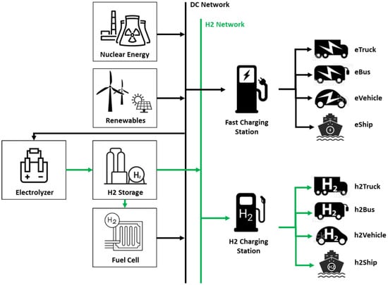 The purpose is to explore the power options available for a fast-charging station, as shown in Figure 7. A nuclear reactor, photovoltaics, or wind turbines can power the system. A hydrogen storage fuel cell system is used to store excess energy. This system converts surplus power to hydrogen via an electrolyzer, which is stored in a tank and can be consumed by the fuel cell when required.