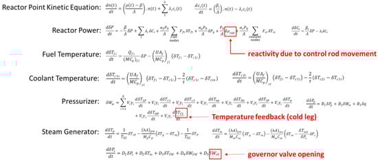 The nuclear model comprised several subsystems, including neutronics, core thermal-hydraulics, a T-average controller, piping and plenums, a pressurizer and its controller, and a U-tube steam generator modeling and control. The neutronics subsystem used point kinetics with six delayed neutron groups and included nonlinear terms. The core thermal−hydraulic model had three axial sections, with each section consisting of one fuel node and two coolant nodes, resulting in nine differential equations. The T-average controller utilized the average coolant temperature as input to adjust the reactivity introduced by control rods. The piping and plenums included two piping systems for the hot and cold leg, four plenums for the steam generator input and output, and the reactor upper and lower, assuming mixed volumes. The pressurizer was represented by determining energy and volume balance, as well as the mass in the pressurizer, reflected by water expansion in the coolant nodes in the primary loop. Finally, the U-tube steam generator model and control used a simple steam generator schematic with three subsystems: the primary fluid, the secondary fluid, and the tube metal. The paper also assumed no control action for the steam generator and that the proposed design would only be applied for small perturbations. For a comprehensive understanding of all modeling processes, it is recommended that readers refer to the cited sources [37] for a detailed description of modeling and transient simulation. Due to space limitations, mathematical approaches and equations are omitted in this text. The software MATLAB/Simulink was utilized in this study to facilitate state space representation calculation and system time response analysis. Figure 8 demonstrates the primary function of controlling reactor output power by identifying the variables influencing power variation.