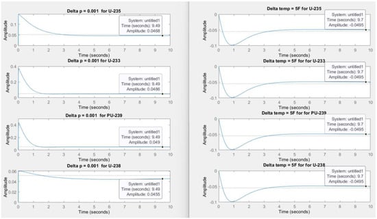This modeling study incorporated four distinct types of fuel: PU-239, U-233, U-235, and U-238. The primary objective was to assess the behavior of transient effects and resulting power variations by altering the fuel properties. Figure 10 illustrates the simulation results for each nuclear fuel, considering an external reactivity perturbation of 0.001 and a 5-degree Fahrenheit increase in the moderator’s temperature. The findings indicate that a 0.001 external perturbation leads to an approximate 4.7% increase in power rate. U-233 and PU-239 demonstrate similar behavior, with the power rate stabilizing within approximately 2 s, while U-238 takes longer to stabilize, at around 5 s. The fractional power rate resulting from a change in moderator temperature is comparable across all nuclear fuels, settling at −4.7% of the power rate after 4 s.