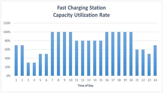 The first step is to determine the parameters for the fast-charging station, including the historical capacity rate (as displayed in Figure 14) and the model parameters for the most common type of electric vehicle that will utilize the system (as outlined in Table 2). Using these parameters, the energy management system will generate a time-series energy load (created through the modeling outlined in Section 2.2) and a load-following pattern that will be utilized to set the nuclear reactor.