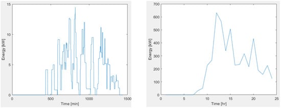 One of the potential outcomes from the 24-h simulation is illustrated in Figure 15. The chart on the left displays the time series results in minute intervals, while the chart on the right exhibits the results in hourly intervals.