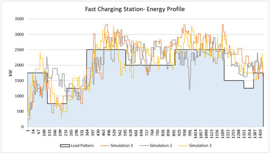 Figure 17 compares the energy load pattern used to simulate both the energy profile for the fast-charging station and to set the load following for the nuclear reactor, as well as three different simulation results. It is evident that, although the energy load follows a pattern, the high variability of the load poses a critical issue for maintaining a constant energy flow, thus highlighting the importance of integrating nuclear with renewable and energy storage systems.