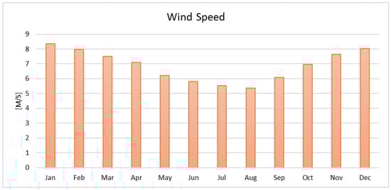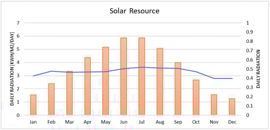 For the technical and economic analyses, a 1-kW generic flat plate solar panel with a 25-year lifespan was considered for the solar system, while a 10-kW generic turbine was considered for the wind system. Figure 18 shows the solar radiation and clearness index profile, while Figure 19 depicts the monthly average wind speed profile.