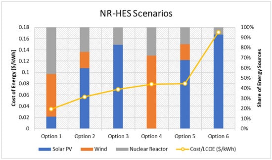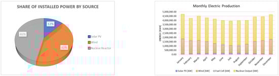 Figure 20 summarizes several system configuration options, with option 1 being the most feasible. It has a cost of energy of USD 0.35 per kWh and an energy mix comprising 46% nuclear reactor, 42% wind energy, and 12% solar energy, as displayed in the left chart of Figure 21. The right chart in Figure 21 shows the monthly energy production by source, which also includes the fuel cell representing the use of hydrogen as energy storage to supply the load when the primary sources are insufficient.