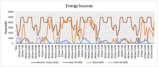 During the simulation, certain assumptions were made. Given that an NPP can provide reliable and cost-effective energy, it is considered the primary source for the system, operating as load following based on the energy load pattern. However, as mentioned earlier, the load pattern does not accurately represent the energy profile. In a realistic scenario, the energy profile has rapid daily fluctuations that the NPP cannot accommodate. Therefore, the system requires additional energy sources to ensure reliability. Renewable sources will generate additional energy for the system. Since solar and wind energies are intermittent, any excess energy will be stored using a hydrogen system (through electrolysis and fuel cells) to provide energy to the system when neither nuclear nor renewable energy sources are available.