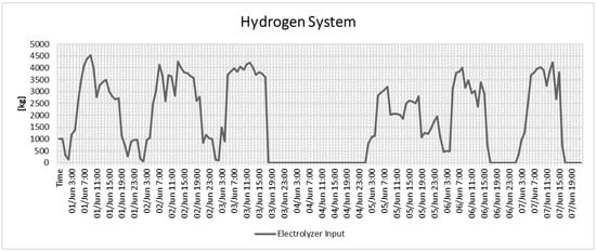 Figure 23 displays a 7-day timeframe demonstrating the hydrogen system utilized as an energy storage method. It shows the quantity of hydrogen produced in kilograms from the excess energy generated by the energy sources. The hydrogen generated is stored in a tank to be utilized as fuel for the fuel cell generator, producing electricity when necessary.