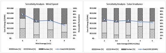 The sensitivity analysis in this paper considered two parameters: solar irradiance and wind speed. Varying these parameters results in a recalculation of the optimal rates of solar and wind, which in turn affects the energy cost. The default value for average wind speed used in this paper is 7 m/s, but the sensitivity analysis considered four additional values: 5 m/s, 6 m/s, 8 m/s, and 9 m/s. Similarly, the default average value for solar irradiance is 3.6 kWh per square meter per day, but the sensitivity analysis also simulated values of 2, 3, 4, and 5 kWh per square meter per day.