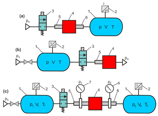Methods of charging and discharge of the air tank according to [15] are used as alternative methods to determine the flow characteristics of the pneumatic components. To measure the flow parameters of pneumatic components, air tanks are used for the in-line test and the air exhaust test in the atmosphere. The schematic diagrams of the measurement systems to determine the flow characteristics of the pneumatic components are presented in Figure 2.