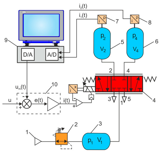In the mechatronics laboratory at the Kielce University of Technology, Poland, a measurement test stand based on the tank method was built. This test stand measures the static characteristics of the proportional directional control valves, the flow rate qv = f(u) and the pressure p = f(u) according to the control signal u. Figure 3 shows a diagram of the measuring test stand of the static characteristics of the proportional directional control valves. The flow rate on the way 1 → 2 and 1 → 4 of the proportional directional control valve is adjusted by the proportional electromagnetic solenoid in the voltage range u from 0 to 10 V. The air decompressed in the tank at pressure p1 flows through the proportional valve along path 1 → 2 to the air compression tank at pressure p2, and through path 1 → 4 to the air compression tank at pressure p4. Pressure changes in tanks are measured with pressure transducers. The measurement method consists of determining the mass flow rate through the proportional directional control valve based on the pressure measurement in the air compression tanks at constant volume (V = const),