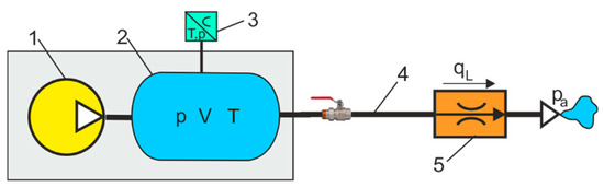 Air tank methods are used to determine the instantaneous mass flow rate, sonic conductance, the critical pressure ratio of pneumatic components, and the charging and discharging times of the tank [16,17]. In the paper [18], the discharge of the supply tank and the charging of the isothermal tank were used to test the flow in various pressure regulators. The article [19] proposes a method to calculate the flow rate characteristics of pneumatic components during the isothermal discharge of air tanks.