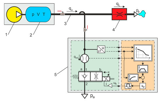 The authors proposed a patented automatic parameter measurement in pipeline branches to directly measure CAS leak rates [21,22,23]. This method estimates the pressure drop ratio of a tank over two time intervals. Figure 5 shows the author’s patented automatic measurement system (AMS) to measure the flow rate through leaks in industrial compressed air pipes. This new indirect method of compressed air leakage is estimated by measuring pressure drop ratios in two-time intervals. The method of measuring compressed air leakage in a pneumatic system based on indirect measurement consists of determining the relation between the air flow qL at the leak point and the air flow rate qvc measured with a flow meter on the branch of pipeline.