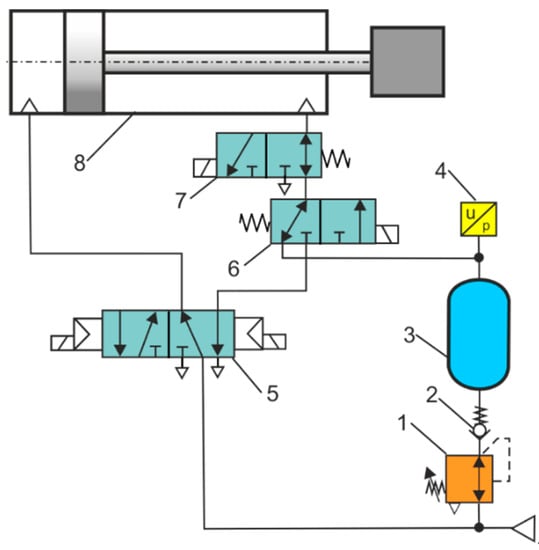 Diagram of the energy saving pneumatic system: 1: pressure regulating valve, 2: non-return valve, 3: CART, 4: pressure transducer, 5: 5/2-way directional control valve, electrically operated, bi–stable, 6, 7: 3/2-way directional control valve, electrically operated, mono–stable, 8: double–acting cylinder with single piston rod.