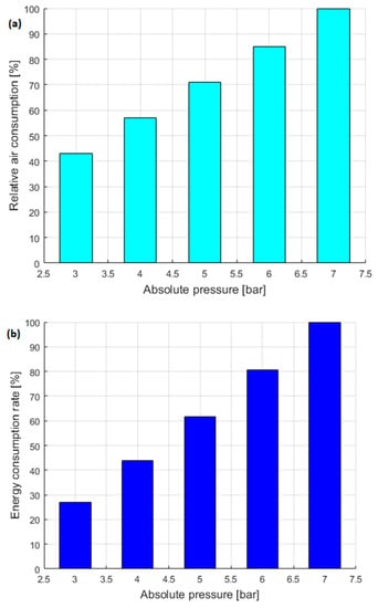 Figure 6 shows a schematic diagram of an energy-efficient pneumatic system based on the concepts of the authors in this review. The air consumption in a pneumatic cylinder decreases as the operating pressure is reduced. The standard operating gauge pressure for the pneumatic system is 6 bar (0.6 MPa). The optimization of air consumption in pneumatic cylinders has several advantages: reduction in energy consumption, reduction in operating costs, reduction in maintenance and service costs, and reduction in unplanned downtime and related costs. The average air consumption in a double-acting pneumatic cylinder for various pressures in the extension and retraction directions is calculated using the formula: