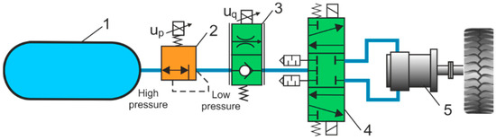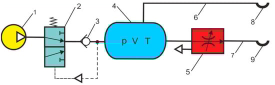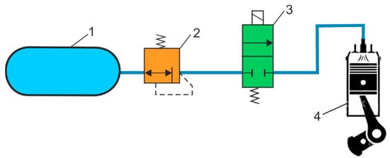 Some articles explore the possibility of recovering and storing compressed air energy by introducing additional CARTs into the pneumatic control system. Examples of energy-efficient pneumatic control systems are discussed in [26]. In [27], methods for reducing air consumption in pneumatic actuator systems were proposed. CART is used to absorb exhausted compression air, and a booster valve raises the air to a higher pressure to be used again. According to experiments, cylinder exhaust air can save about 40% of compressed air. A pneumatic cylinder very often produces thrust in only one direction when the piston rod is extending, and in the opposite direction when the piston rod is retracting, a much lower pressure is sufficient. Here, it is possible to use CART to reduce the supply pressure. Energy savings consist of accumulating exhaust air in a CART recovered from the pneumatic cylinder as it is extended. The energy stored in a CART is then used to retract the actuator. Energy savings in the pneumatic cylinder system is associated with reduced consumption of compressed air.