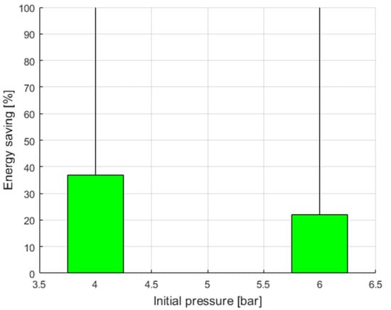 Reducing the air-inlet temperature by 1% results in energy savings of 3%. The higher the pressure required for the CAS, the higher the cost of producing compressed air. Reducing energy consumption contributes to reducing carbon dioxide (CO2) emissions into the atmosphere. In the European Union, CAS energy consumption accounts for approximately 10% of total industrial energy consumption. Approximately 75% of CAS operating costs are related to energy consumption. The efficiency of the CAS system is very limited due to misuse, mismanagement, and the low efficiency of pneumatic components, which is approximately 30%. Increasing the size of the tank results in greater energy savings. For example, a tank upsizing from 2.5 m3 to 4.2 m3 should increase the compressor idle time by 62%. Publication [10] presents a systemic approach to CAS energy efficiency, including, among others: system analysis and harmonization of compressed air production and consumption, minimization of losses, optimization of pneumatic systems, ans automation and integration of the device.