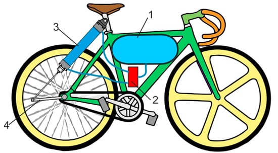A prototype of our HTB design has the following parameters: air motor torque 50 Nm, air motor power 250 W, tank capacity 2 × 9 m3, tank pressure 25 MPa, travel time 30 min, travel distance 7.5 km at maximum speed 15 km/h. In comparison, an e-tricycle assist pedal with 500 W power and 500 Wh battery capacity has a speed of 25 km/h, torque 60 Nm, and a travel distance of 40 km. The travel distance of an e-bike depends on the battery capacity.