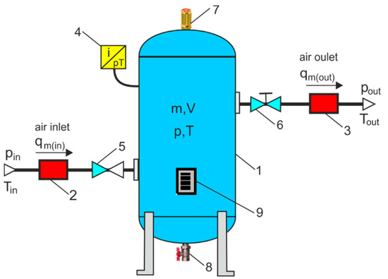 This review deals with both high-pressure and low-pressure pneumatic systems. In high-pressure pneumatic systems, compressed air is usually stored in a tank, with pressures ranging from 100 to 500 bar depending on specific applications. High-pressure pneumatics play an important role in modern manufacturing processes, modern technologies, and energy storage. High-pressure compressed air has many applications, most commonly in air propulsion systems (200 bar), underwater survey activities (450 bar) and air storage in tanks (500 bar). Most applications of low-pressure industrial pneumatic systems use up to 10 bar pressures. In industrial practice, this pressure level is used for operational and economic reasons. The low-pressure pneumatic system is also due to the technical capability of single-stage compressors. These compressors can be stationary or mobile, depending on their intended use. Low-pressure pneumatic systems are compressed air systems (CAS) used in industry, manufacturing, mining, power engineering, road transport, railway, marine and aviation, pneumatic tools, medical equipment, blow-off technology, cleaning, and cooling, etc. [1]. CAS networks are used to transmit and deliver compressed air energy (CAE) to pneumatic equipment (actuators, motors, engines, tools), machinery, and conveyors, etc. Compressed air must be delivered with sufficient capacity, pressure and quality to meet the demand of consumers and ensure the proper operation of pneumatic devices [2]. Incorrectly designed and selected CAS can increase energy costs, cause equipment failures, reduce production efficiency, and increase maintenance requirements [3]. In CAS, there are also many cases of wasted compressed air energy, mainly due to leaks, pressure drops, overpressure, misuse, and mismanagement of the compressed air distribution [4]. Industrial CAS consists of three major parts: the compressed air production plant (compressors, compressed air tanks, drying, filters, regulator systems), the compressed air pipeline, and compressed air consumers [5]. To receive, store and deliver compressed air, CASs use compressed air receiving tanks (CARTs), also called air compressor tanks, compressed air tanks, compressed air receivers, or compressed air storage tanks. CARTs provide additional compressed air capacity during periods of increased demand and provide a reserve of compressed air when the air compressor is turned off. The compressed air stored in CART is used as a temporary demand spike, known as “events of sudden demand”, and as a standby supply system when a short-term power outage occurs and the compressor loses power unexpectedly (usually due to a breakdown). In the event of short-term demand for high air capacity at long intervals, stand-alone tanks are used. Large stand-alone expansion tanks are used for a small-capacity compressor. Two types of CARTs are used in the CASs: