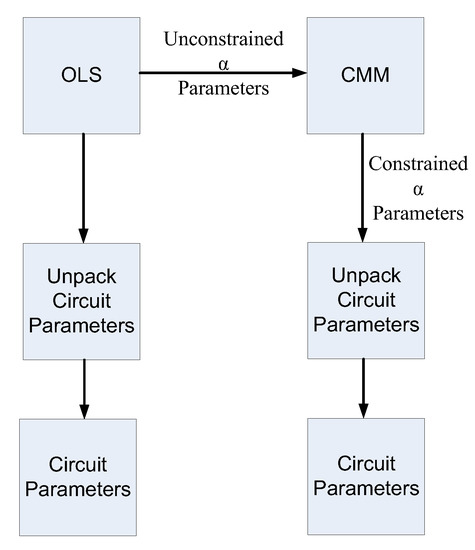 - By using the Ordinary Least Squares (OLS) regression off-line to solve Equation (3), but without using the constraint as expressed in Equations (4a)–(4e). This has been performed in simulation and experimentally and has been used as starting point for the subsequent minimization,