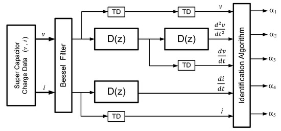 Over the years, a number of methods have been developed and applied to the area of estimating parameters of a DLC, in particular trying to deal with their inherent nonlinearity that makes their external behavior differ from the one of common electrolytic capacitors. The first group of methods is based on electrochemical laws and describes the internal phenomena accurately; however, they are relatively intensive and not ideal for practical applications in power electronics and real-time control [9,10,11]. The second group of methods’ parameter identification is based on Electrochemical Impedance Spectroscopy (EIS) which focuses on studying the frequency response of SCs to determine their characteristics; however, it comes with pricy hardware and post-processing routines [12,13,14].