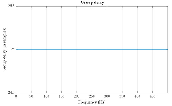 MATLAB® has been used to design a 50th order FIR tuned to have a passband frequency of 100 Hz and stop band frequency at 180 Hz. The magnitude frequency response and the phase response of the filter is shown in Figure 4. The group delay of the Digital Derivative Filter is determined to be 25 samples from the Group Delay plot as shown in Figure 5. The sampling frequency adopted is fs = 1 kHz.