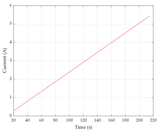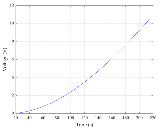 As explained earlier, a constant current test would not be advisable because of the presence of the column in the A matrix, which would make the matrix rank-deficient. For this reason, a ramp input has been applied. Figure 6 depicts the input current, while Figure 7 depicts the corresponding voltage output.