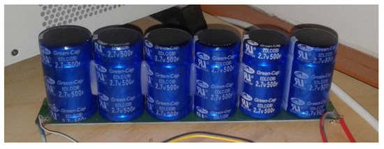 Figure 9 shows the experimental rig which is composed of a “Green-Cap” MH47765 Super Capacitor bank of 6 × DLSC connected in series. Each single DLSC cell is 500 F with a voltage rating of 2.7 V.