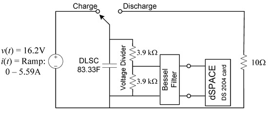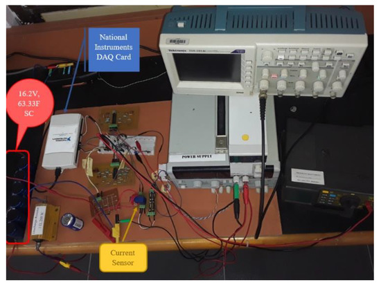 The Data Acquisition System consists of the dSPACE AutoBox DS1007 System. The DS2004 card has been used, which is the dSPACE card used to read an Input Analog Signal. The input range of the DS2004 card is 0–10 V. Since the full charge of the CBank is 16.2 V, a voltage divider has been used as an intermediary to the dSPACE system. A National Instruments (NI) USB 6211 DAQ system was utilized as a redundant data capture system but did not play any crucial role as dSPACE delivered better results. The sampling frequency of 1 kHz has been selected for the charge and discharge tests. The Experimental Test Rig is shown in Figure 11.