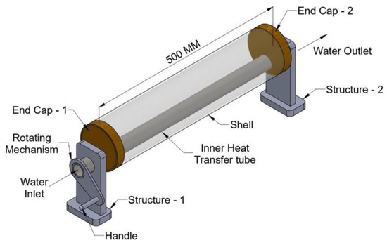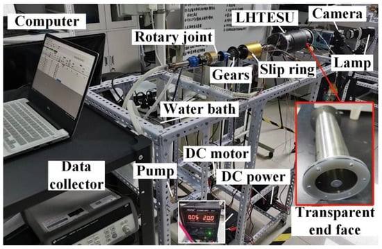 There are many computational studies on rotation in LHTES systems; however, due to the complexity of the systems, there is little attention towards experimental work. Fathi and Mussa [35] experimentally analyzed the rotation of a horizontal shell-and-tube LHTES system with paraffin wax PCM. Rotational speeds of 3, 6, and 9 rpm both clockwise and counterclockwise were studied. No significant difference in the melting time was found when comparing the still case to the rotating cases. After 10.75 h the 9-rpm case had an 8% increased liquid fraction compared to the fixed case. The authors, however, did not fully analyze the melting time and did not fully charge the system. Another experimental study conducted by Yang et al. [36] analyzed rotation in a horizontal shell-and-tube LHTES system with paraffin PCM. Three cases were studied including static, one flip 180° after 120 min, and 0.13 rpm. The flipping time was then optimized using dimensionless flipping times of 0.25, 0.375, 0.625, and 0.750. The constant rotation case decreased melting time by 19.35% compared to the static case. Flipping the system at an optimal point of 0.375 decreased melting time by 37.50% compared to the static case. A further energy analysis showed that flipping the system takes an additional 5 J of energy, whereas the constant rotation is an additional 1500 J. The energy required in both cases was considered negligible by the authors. The experimental methods and apparatus, shown in Figure 2, provide a thorough explanation of the components used to build the system, which can be used for future research.
