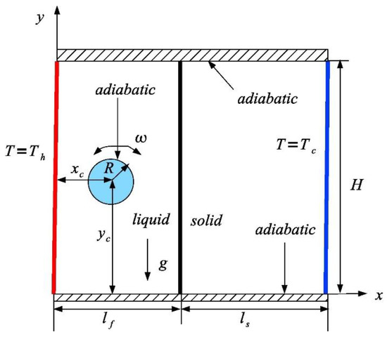 Another rotational technique applied to LHTES systems is the use of a rotating cylinder located directly within the PCM. Selimefendigil and Öztop [40] numerically studied the fluid flow and heat transfer characteristics of RT-25 in a rectangular enclosure LHTES system with the addition of a rotating cylinder. The system, which is similar to those in the following studies, is shown in Figure 4. The system was analyzed in the melting process with angular rotational speeds of −7.5 to 7.5 rad/s, vertical locations of the cylinder from 0.25H to 0.75H, and two different sizes of cylinders, 0.05H and 0.1H. The study determined that the average Nusselt number increases by 22.50% for an angular rotational speed of 7.5 rad/s compared to the no-rotation case. In addition, spatial average heat transfer is 19.8% higher for the stationary cylinder and increases 10% for clockwise rotation of the larger cylinder. The study did not include an analysis of the rotating cylinder on discharging.